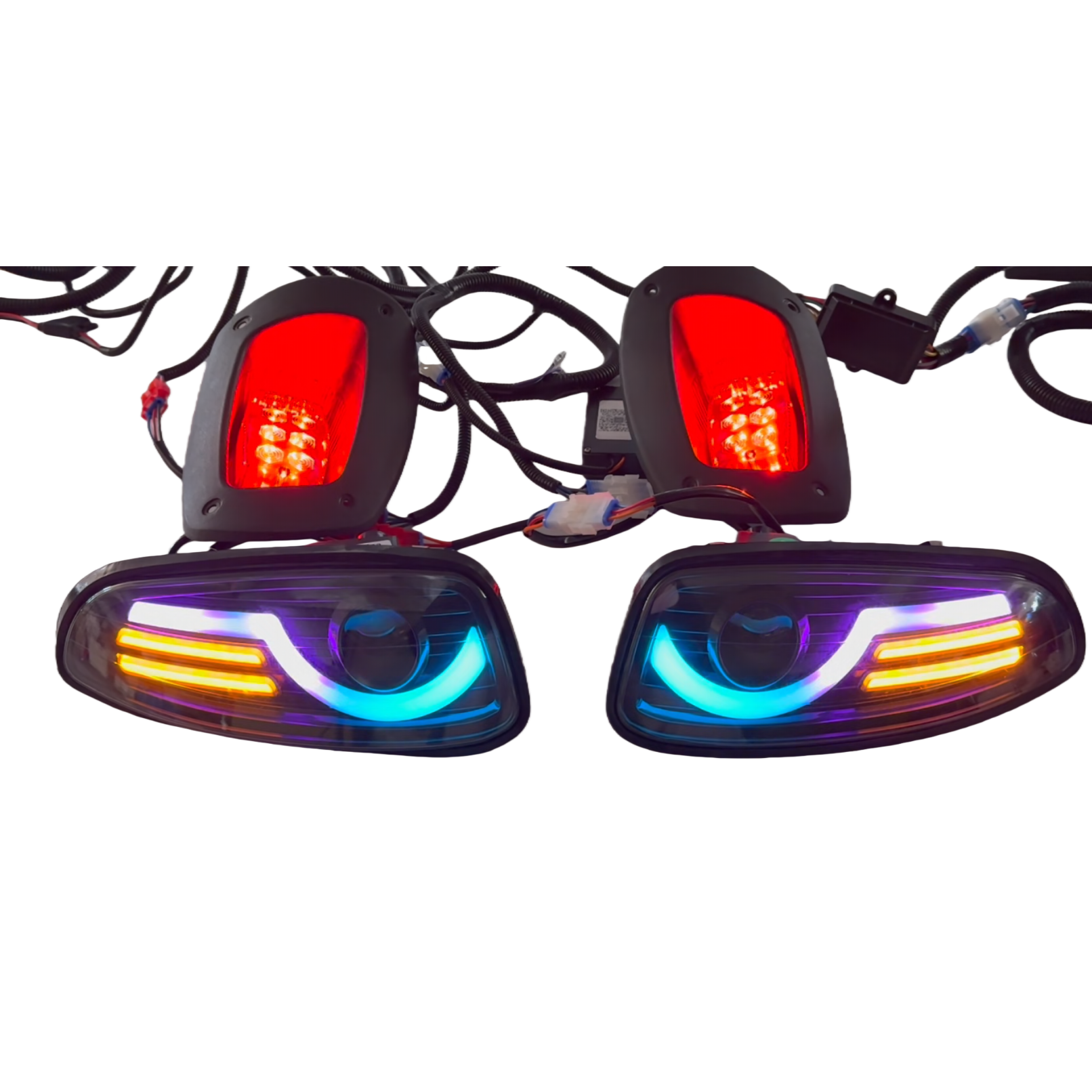 Upgrade your EZ-GO RXV golf cart's visibility and style with this premium LED light kit, specifically designed for 2008-2015 models. This deluxe light kit combines bright, reliable and long life performance of LED technology for enhanced safety and aesthetics. The complete kit includes LED headlights, Runnig Light, LED taillights, turn signal switch, horn, brake pad and deluxe harness. This light kit offers superior illumination for both day and night operation. Espacially RGB running light, it can change hundreds of colors and give your cart a unique style. You and your cart will be the highlights on streets. Built with durable, weather-resistant materials, this light kit ensures long-lasting performance on the course or in your community. Easy to install with plug-and-play connections, this lighting system integrates seamlessly with your cart's existing wiring. Perfect for golf course maintenance crews, security patrols, or residential users who need reliable lighting for early morning or evening drives.